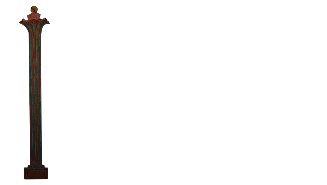 In Commerative Column K, DeMonte created a comic-book version of a column from classical Greek architecture—the kind that historically celebrated the victories of men in war. She topped her column with two young girls in Victorian outfits balancing the planet between their feet. For DeMonte, it is women who literally hold up the world.