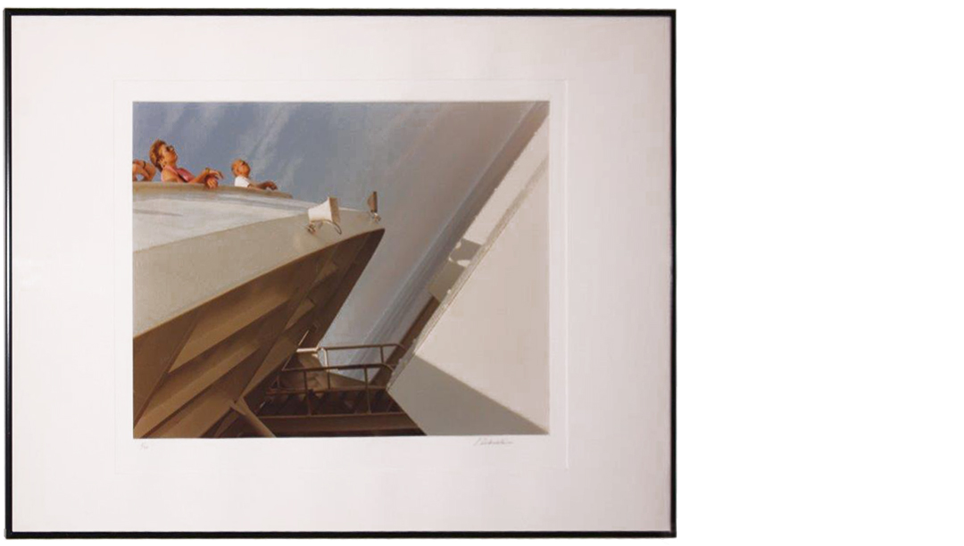 Stanislaus Dubowski was a photographer who collaged strips of Kodacolor film to create images with off-kilter juxtapositions of space and perspective. His work often contained subtle jokes and puns, as in Long Island Sound, which is in the Museum’s Permanent Collection. The photograph is of passengers aboard the Port Jefferson Ferry with faces turned toward the sun. The front of the ferry resembles a huge open mouth, as if the ferry itself is about to speak—to make a “Long Island sound.”