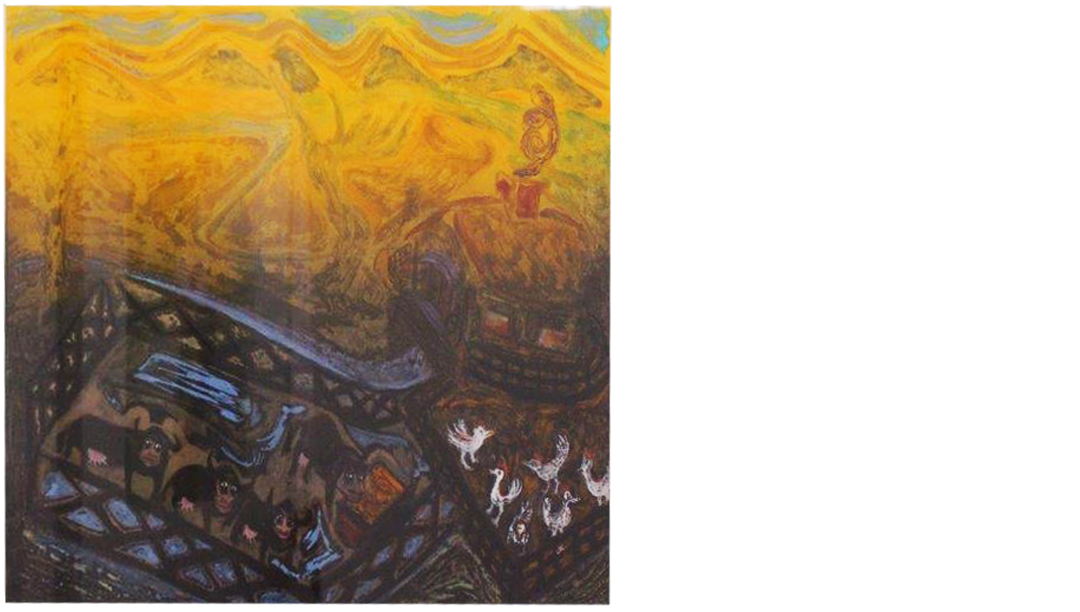 Farm Friends is a complex monoprint and is an example Sullivan’s signature style, which is a fusion of abstraction and folk art. Sullivan died in 2009 at the age of 90.